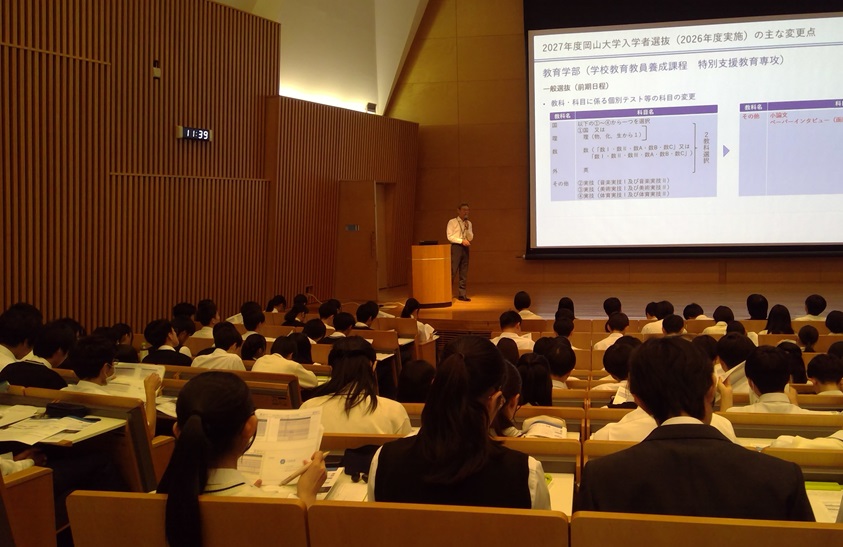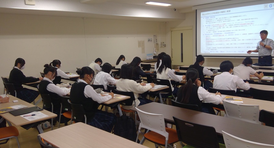 午前中の概要説明では、岡山大学の取り組みや大学入試についての説明をしていただき、大学の学問や教育、研究について、また留学制度などについて興味深く聞くことができました。